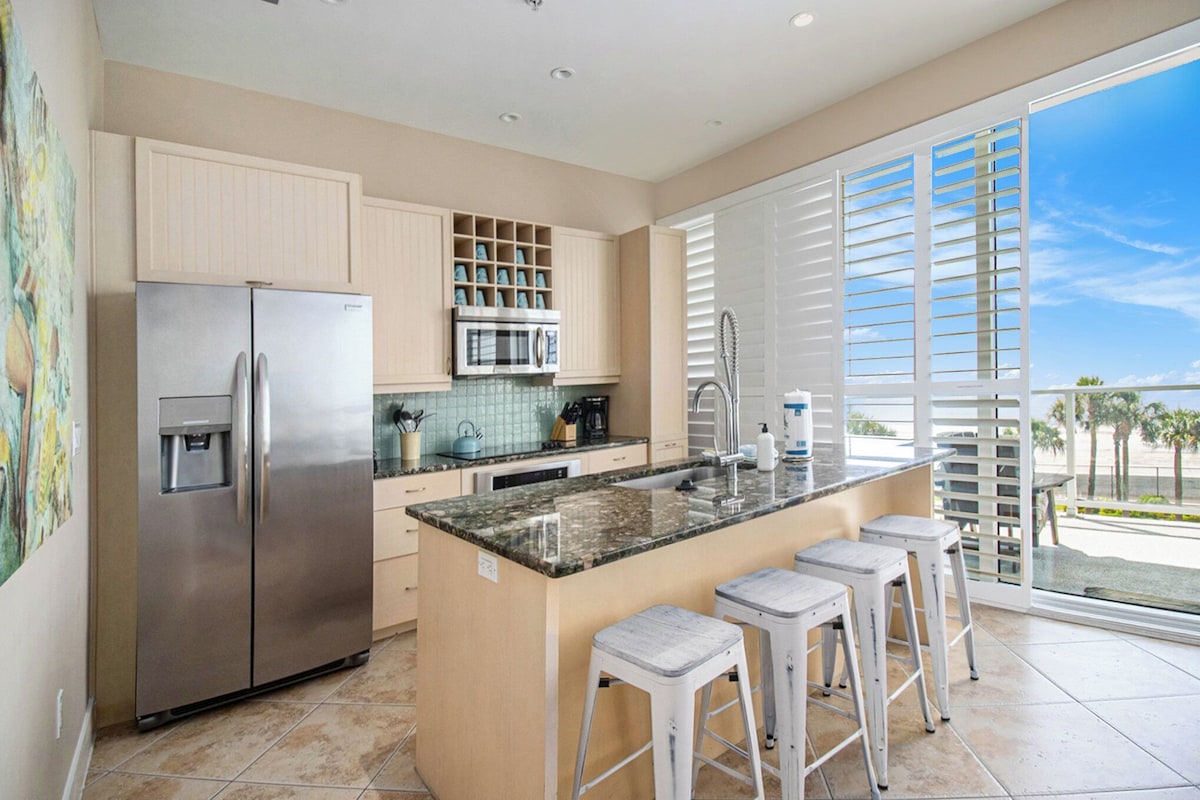 Adorned in modern beach décor, this unit boasts a breathtaking wide-open view of the Gulf from the living area, making it the ideal spot to unwind after a day of adventure. The fully-stocked kitchen features stainless steel appliances, breakfast bar, full-size fridge, oven, microwave, dishwasher, and even a Keurig for your morning coffee fix. For those needing to stay connected, complimentary Wi-Fi is included, and a washer and dryer in the unit are available for freshening up after your sandy beach excursions.
