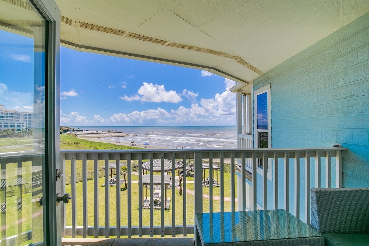2 Bedrooms • 2 Bathrooms 2 Baths • Sleeps 5-8"Seascape - Barefoot Bliss" is a beach lover's dream at the beachfront Seascape Condominiums! Unlike most condos in Galveston, Seascape is located directly on the beach, just west of the Seawall, there is no need to cross the busy street to feel the sand between your toes! This beach-side condo has incredible views of the sunrise over the ocean. Soak up the sights and sounds from your beach-facing balcony or relax by the swimming pool (heated year-round) and hot tubs. Condo sleeps 8 with king beds in the master and 2nd bedroom, bunk beds and a queen sleeper sofa. 2 full baths (one with bathtub and one walk in shower). Full kitchen w/stove, microwave, dishwasher, coffee maker, toaster, dishes & utensils and granite countertops. TVs in each bedroom, tile floors and newly updated decor. Cable and wifi access. Linens and towels provided. Ready to go to the beach? Grab the chairs and beach toys in the unit and don't forget the sunscreen! Complex features include: direct beach access, elevators, large pool heated year-round, kid’s pool, 2 hot tubs, BBQ pits and full-size coin-operated washer/dryers on several of the floors.